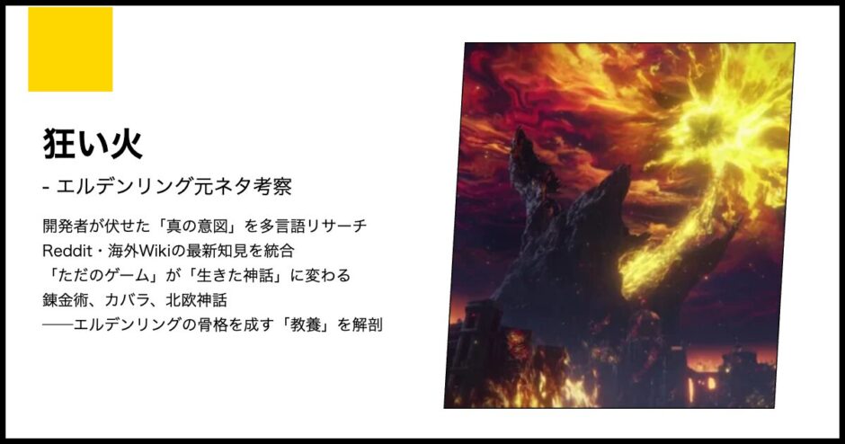 本記事では、エルデンリングにおける最凶の禁忌「狂い火」の元ネタを徹底考察します。ユダヤ教の悪魔「シャブリリ」の伝承や、H.P.ラヴクラフトに影響を与えた文学『黄衣の王』との符号点を検証。さらに、2026年最新のDLC解析に基づき、狂い火の王ミドラの悲劇と「指の母」の関連性からその宇宙論的な真実に迫ります。