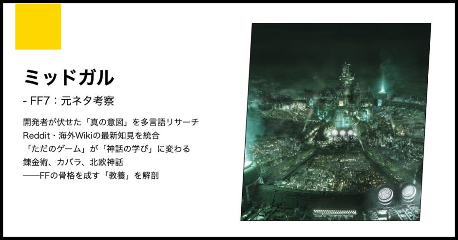 - ミッドガルは北欧神話の巨人解体という犠牲を文明の基盤とした、神話的ディストピアである。