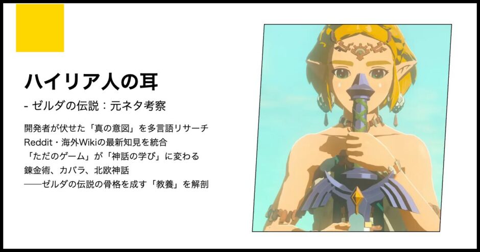 - ハイリア人の耳は女神の声を聴くための生体アンテナであり、その長さは神性の純度と魔法適性の高さに直結している。