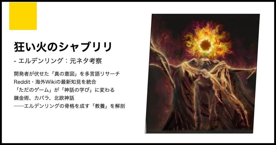 エルデンリング最悪の男、シャブリリ。その名の由来はユダヤ教の盲目の悪魔にあり、DLCで明かされた狂い火の悲劇とも密接に関わっています。タルムードの伝承からロバート・W・チェンバースの文学的影響、さらには実在の哲学までを徹底解析。彼が世界を焼き溶かそうとした本当の理由を、2026年最新の視点で解き明かします。