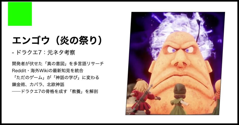 ドラゴンクエストVIIの序盤を彩るエンゴウの「炎の祭り」。その元ネタは、火口に身を投げた実在の哲学者エンペドクレスとシチリア島エトナ山の伝説です。2026年最新リメイクでのビジュアル進化や、シリーズの根幹をなす四元素説の視点から、祭りの背後に隠された理不尽な真実と神への挑戦の物語を詳細に紐解きます。