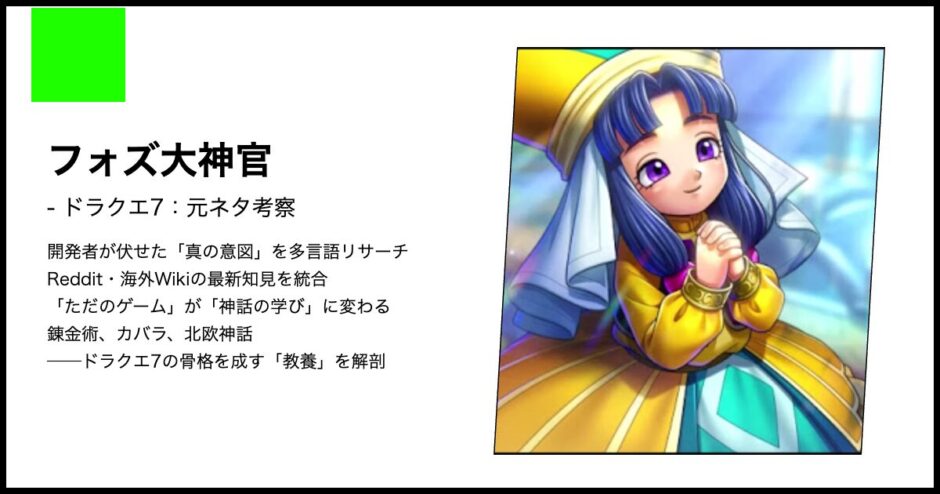 ポルトガル語で河口を意味する名前の由来から、ギリシア語の光、サンスクリット語の法に至るまで、フォズ大神官の多層的な元ネタを徹底解説します。2026年最新作『DQ7R』でのドールルック採用や隠し仲間化の背景に隠された、制作陣の意図と神話的符号を紐解く、リサーチに基づく完全考察ガイドです。