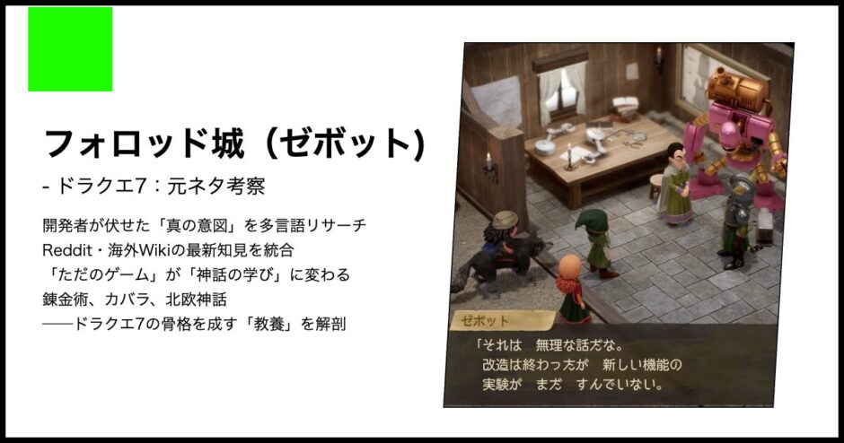 本記事ではドラゴンクエストVIIのフォロッド地方に隠された重層的な元ネタを徹底解析します。地名に刻まれたトールキンの言語体系、ゼボットの名の由来となった児童文学、そしてエリーの行動のモデルとなった不朽のSF短編まで。2026年発売の最新リメイク版での新解釈も交え、悲劇の裏にある真実を解き明かします。