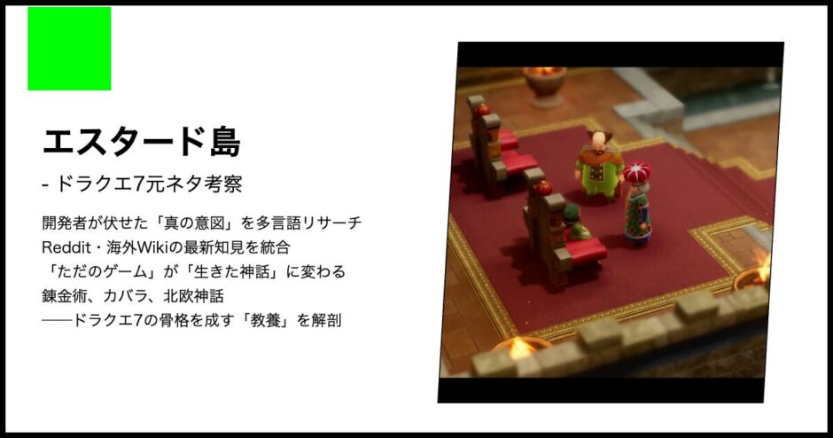 エスタード島は単なる平和な島ではなく、魔王の盲点と神の守護が交錯する特異点でした。言語学的な語源から、聖書のエデンやプラトンのアトランティスとの驚くべき符号点、そして2026年最新リメイクで示された「ジオラマ」としての意味まで、リサーチャーが徹底調査した深層背景を報告します。
